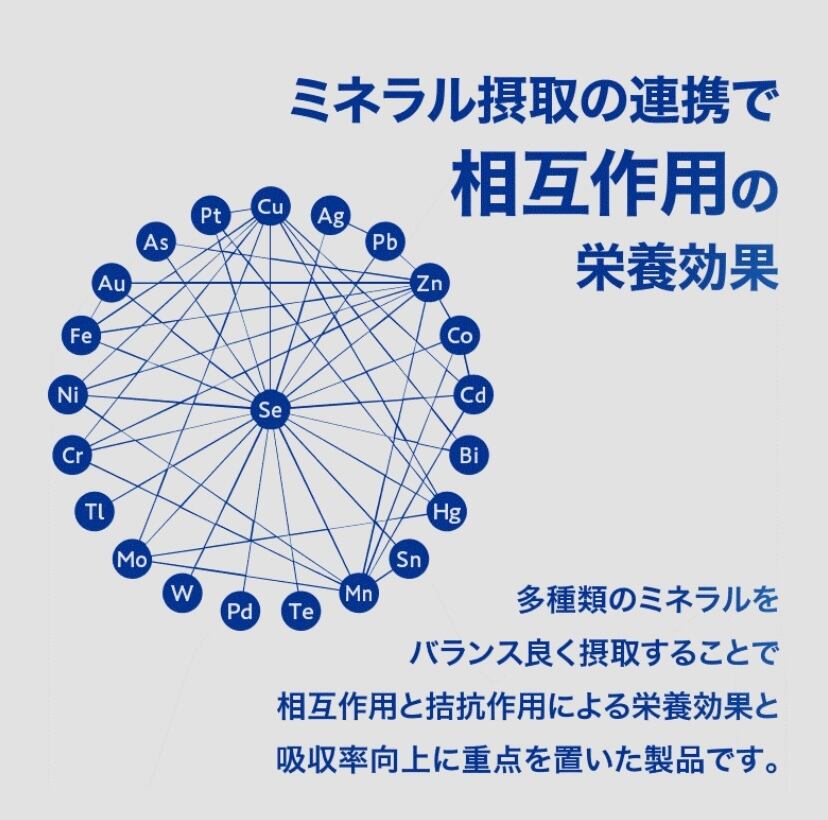このミネラルは鉱石からある特別な抽出方法をしており、吸収力を上げ、相乗効果が期待されています。